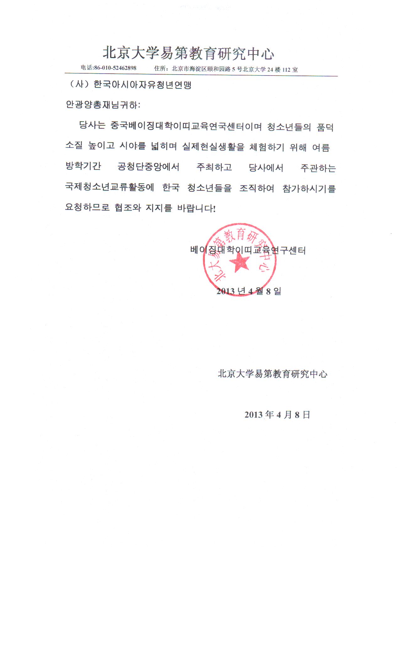 중국공청단중앙에서 발기하고 당사에세 주관하는 여름방학캠프 참가 요청 공문을 보내드리므로 참고 후