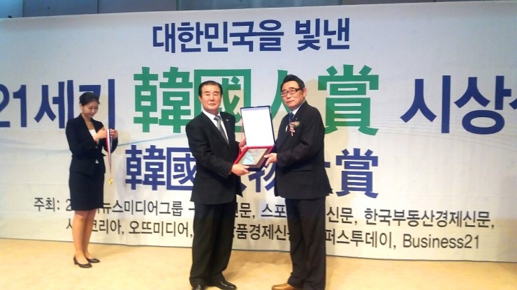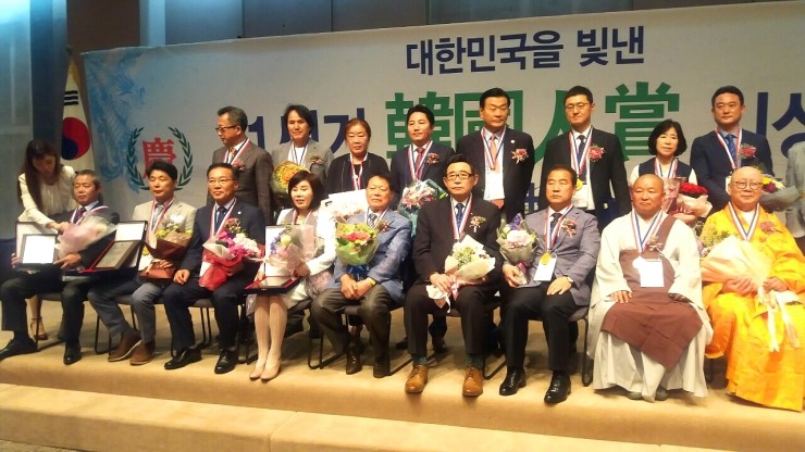 대회장 안광양 총재께서 '한국인물대상' 본상인 '언론발전 공로부문 대상'을 시상하고 있다 이보길 회장, 2018 한국인물대상…